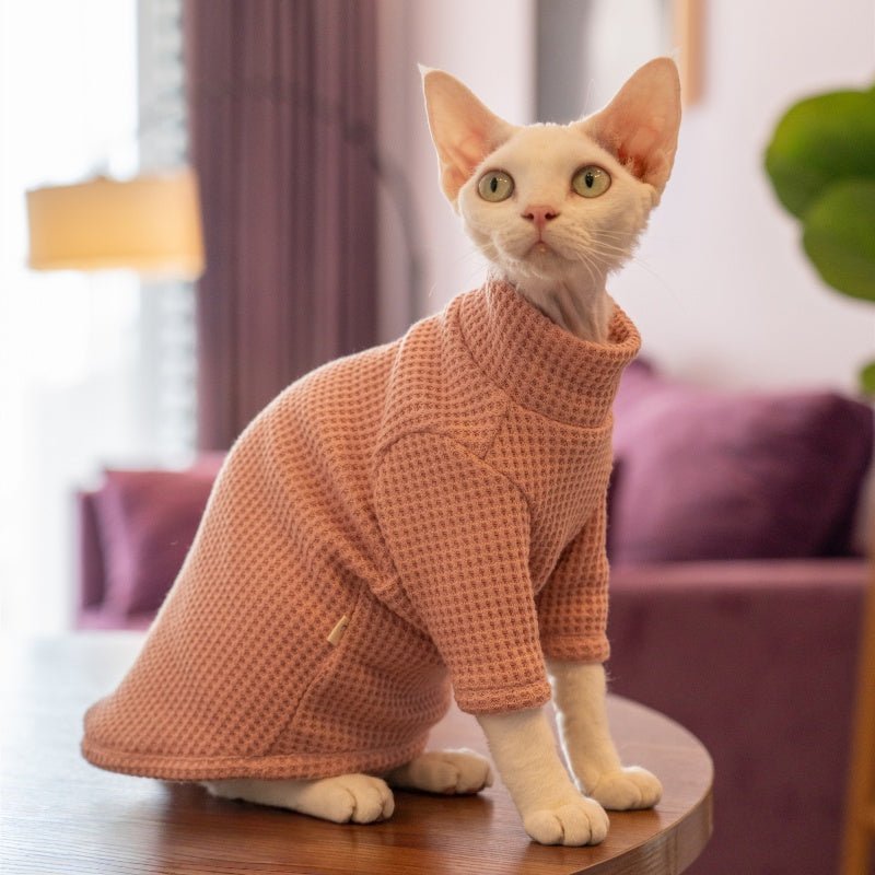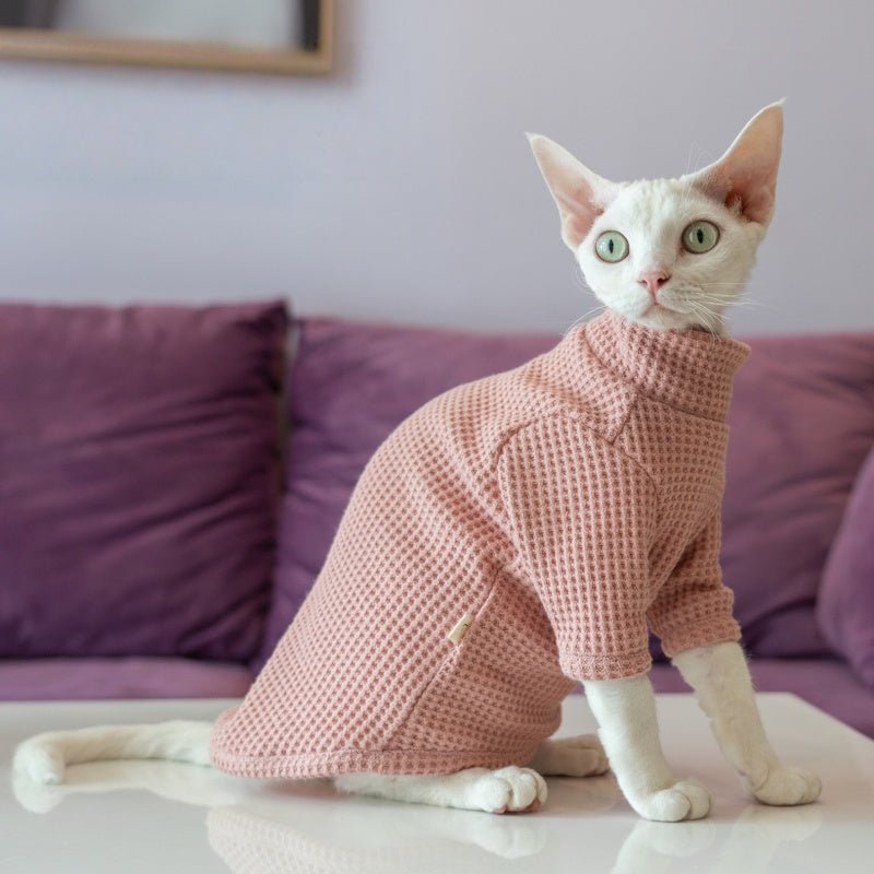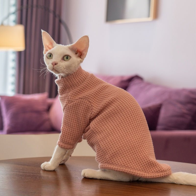 Waffle Knit Cat Shirt - Breathable Cotton High-Neck Pullover for Hairless Sphynx Cats